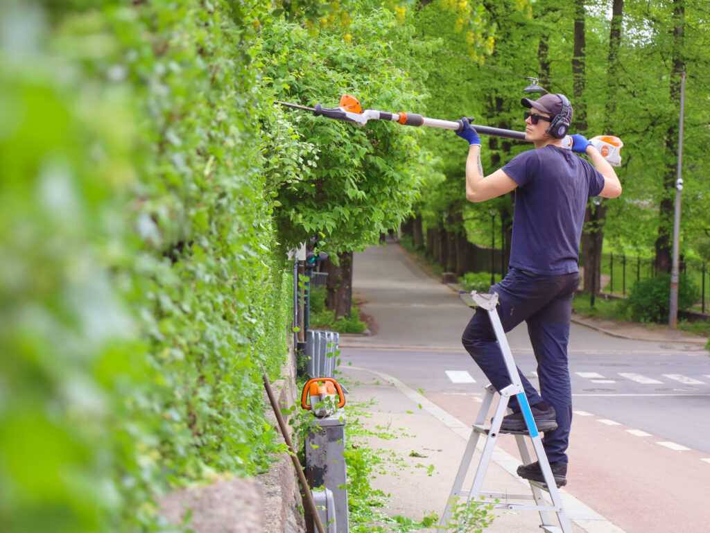 Vi vedlikeholder mindre trær og buskfelt, og fjerner trær trygt ved behov, med samarbeid for større trær.
